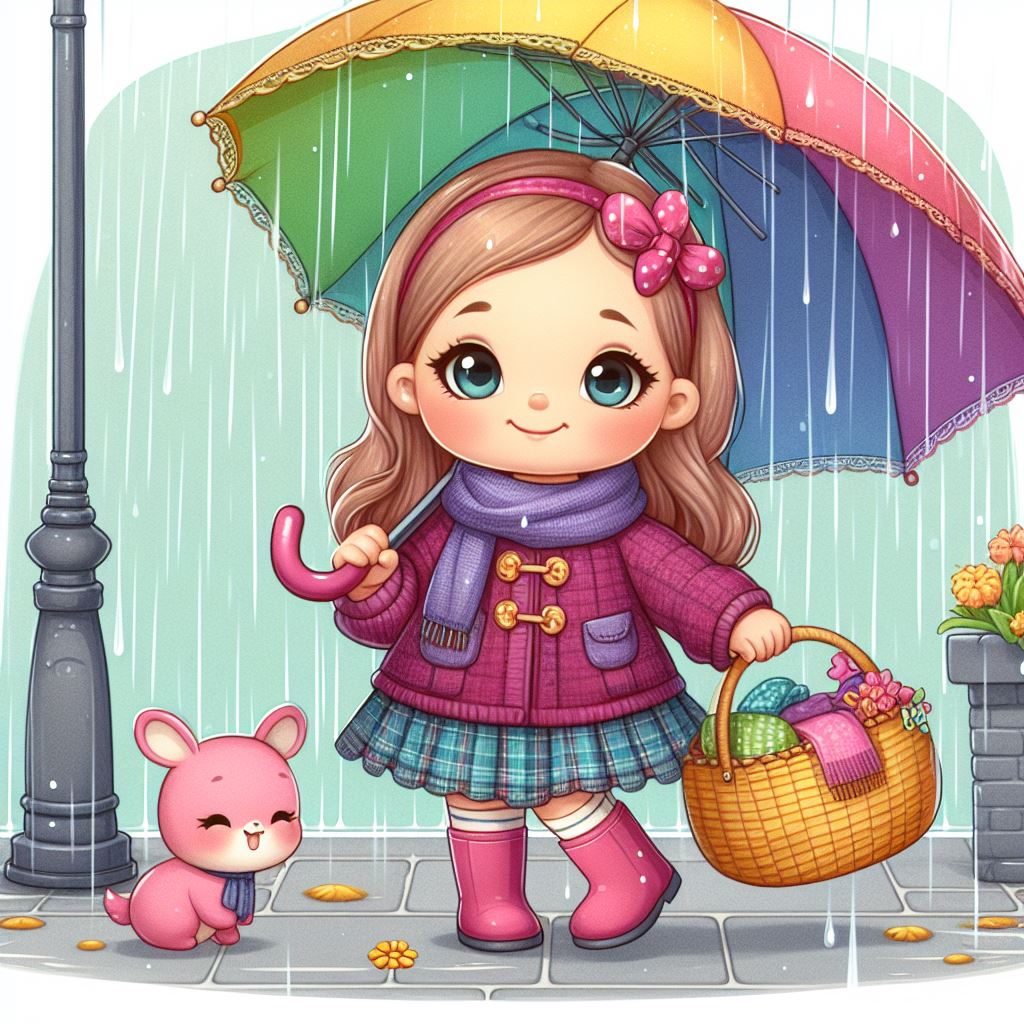 A young girl walks in the rain with a rainbow umbrella, carrying a basket and a small pink animal by her side.