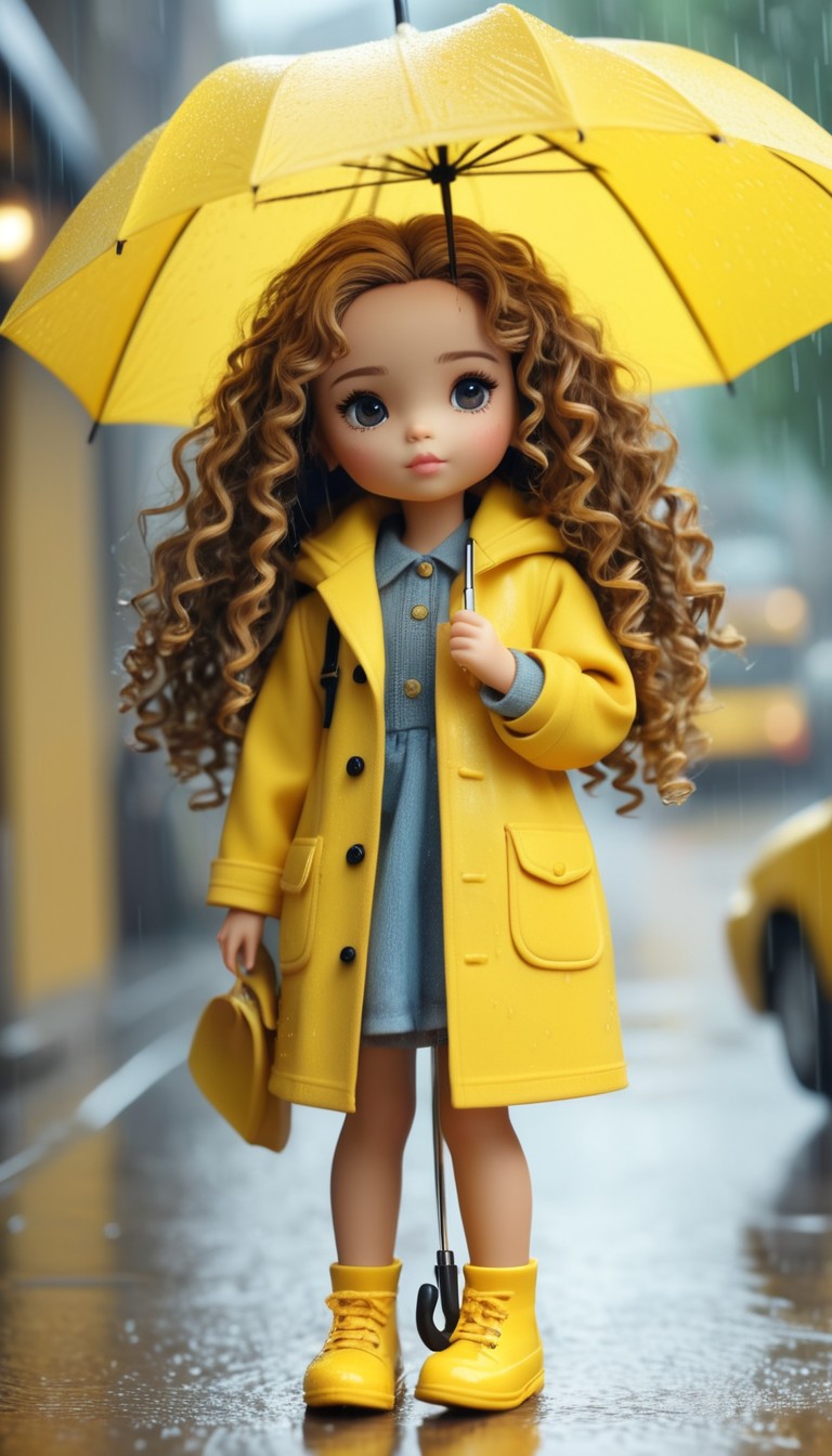 boots, city, cute, doll, dress, fashion, girl, holding, outdoor, rain, raincoat, rainy, sidewalk, standing, street, toy, umbrella, water, wet, yellow