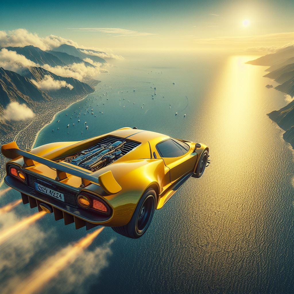 A yellow sports car speeds over ocean, mountains on horizon, sun shining