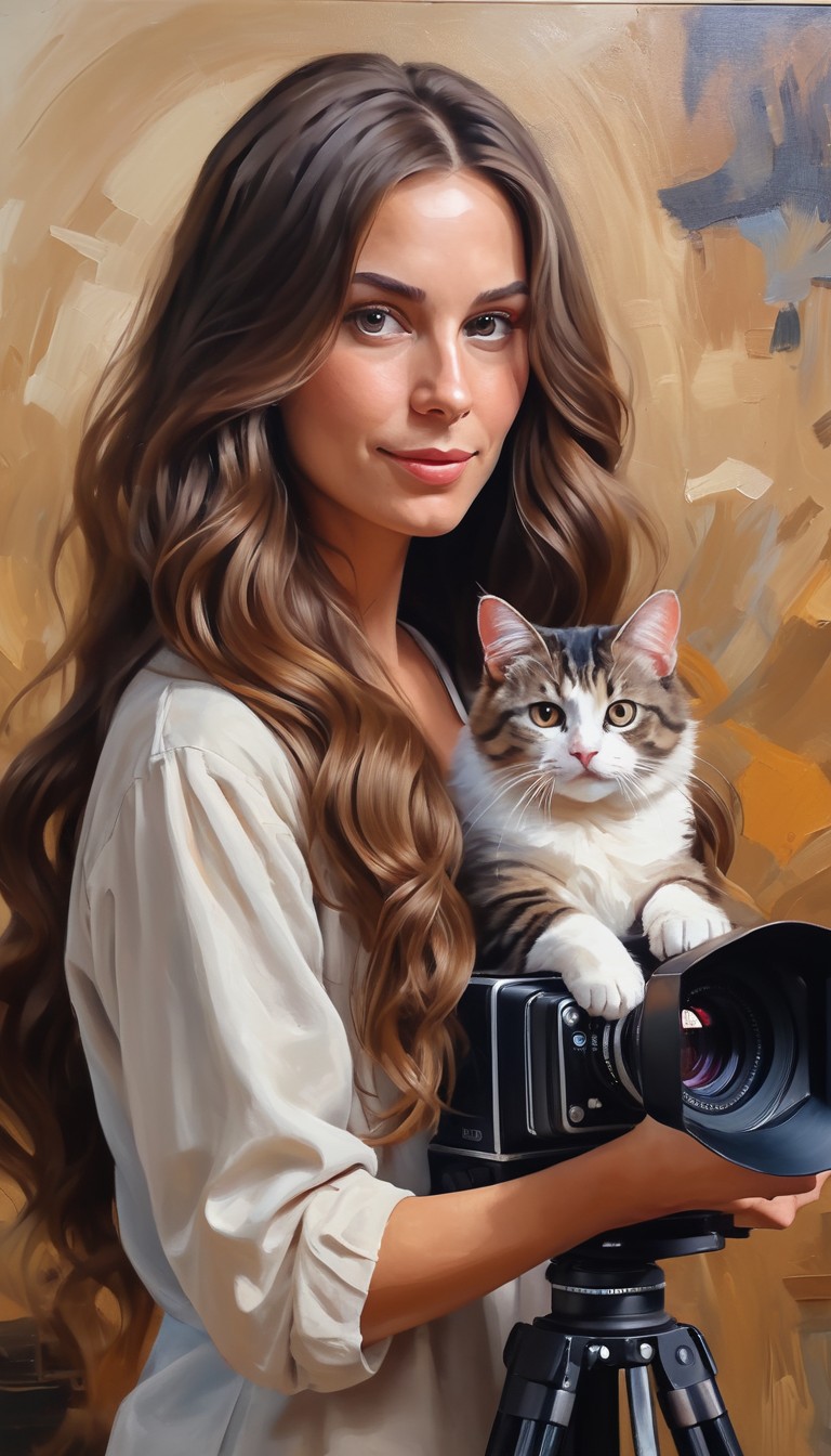background, brown, camera, cat, feline, hair, holding, lens, long, looking, model, pet, photographer, portrait, pose, shirt, studio, tripod, white, woman
