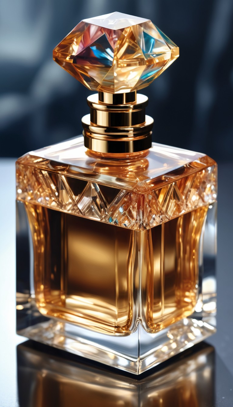 aroma, beauty, bottle, cap, clear, design, diamond, elegant, fashion, fragrance, glass, gold, liquid, luxury, perfume, product, reflection, scent, stopper, surface