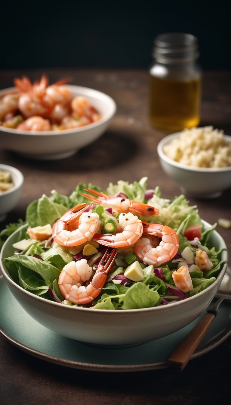 appetizer, bowl, cooking, delicious, dinner, food, fresh, greens, healthy, kitchen, lettuce, lunch, meal, plate, restaurant, salad, shrimp, table, tasty, vegetables