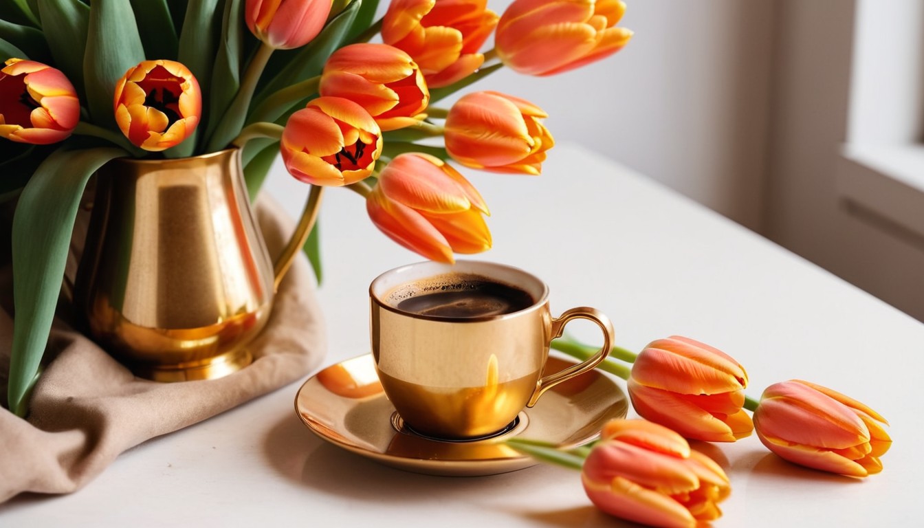A golden cup of coffee sits on a saucer, surrounded by bright orange tulips on a white table.