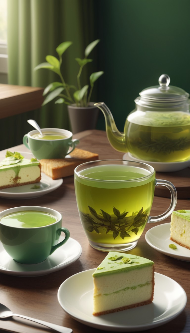 afternoon, beverage, cheesecake, creamy, delicious, dessert, drink, food, green, healthy, matcha, pastry, snack, sweet, table, tea, teacup, teapot, time, wooden