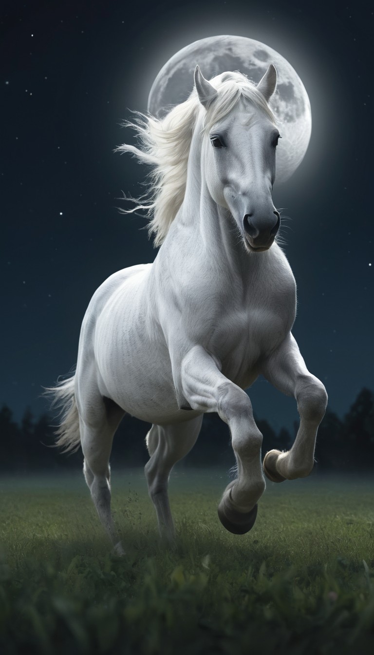 animal, equine, field, freedom, gallop, grass, horse, landscape, mammal, moon, moonlight, motion, nature, night, running, sky, speed, stars, white, wildlife