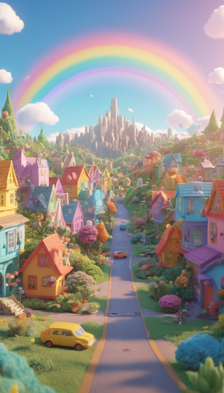 A vibrant, cartoonish suburban neighborhood with colorful houses and lush greenery, overlooked by a city in the distance and a rainbow in the sky.