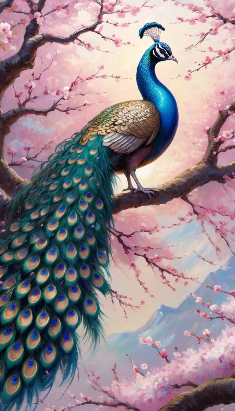 A vibrant peacock sits perched on a branch of a cherry blossom tree, its tail feathers spread out in full display.