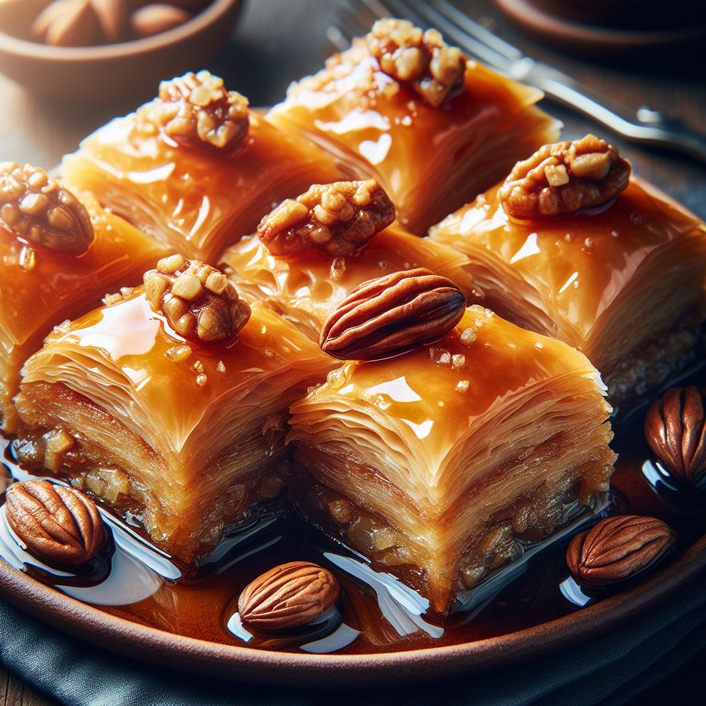 almonds, baklava, caramel, cuisine, delicious, dessert, eastern, flaky, food, greek, homemade, layers, middle, nuts, pastry, pecans, sweet, syrup, traditional, turkish