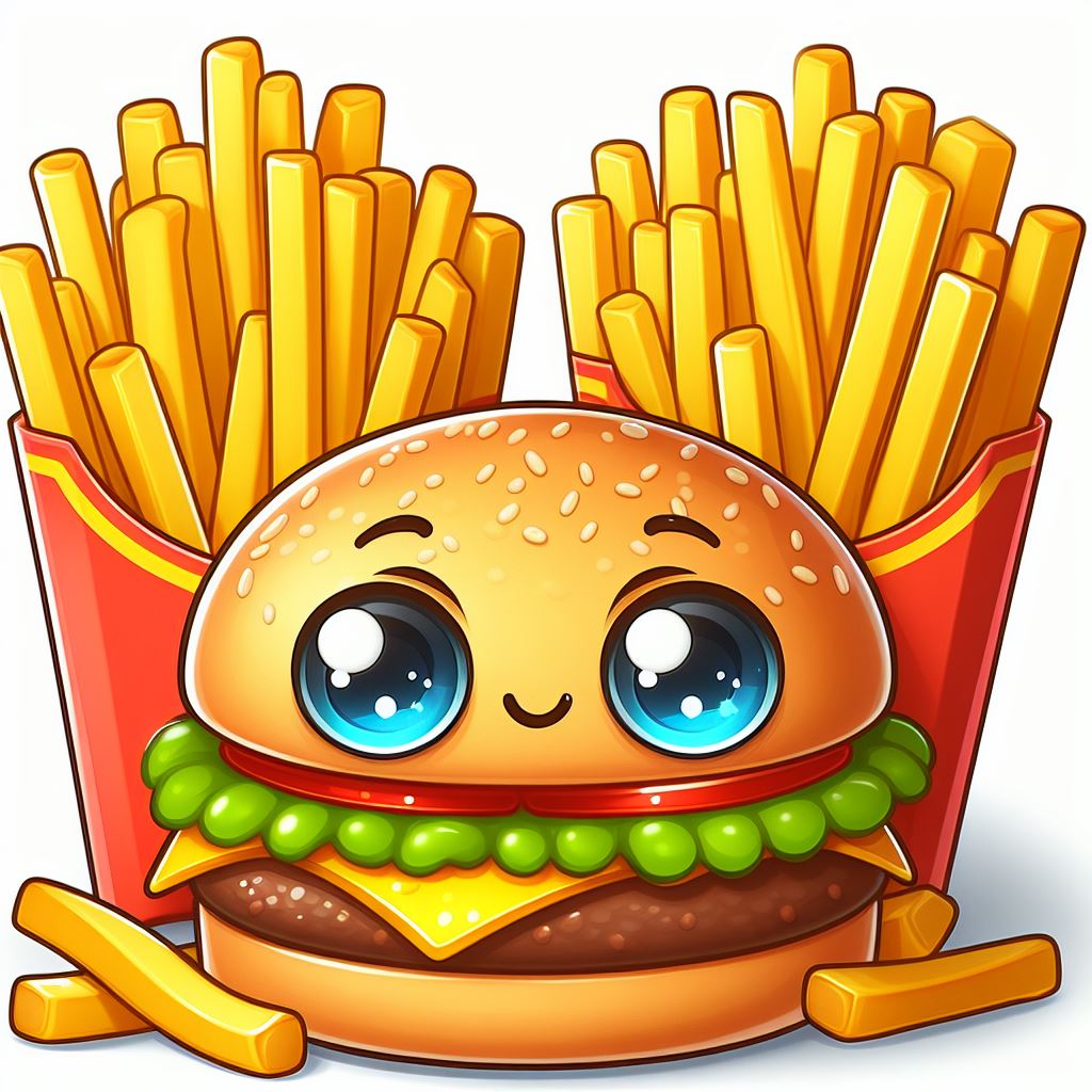 A cartoon hamburger with large, blue eyes smiles happily while surrounded by french fries.