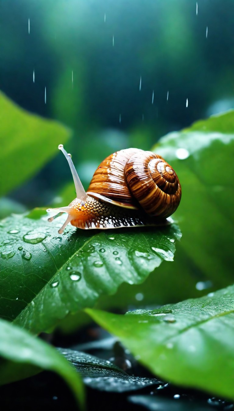Snail on leaf in rain