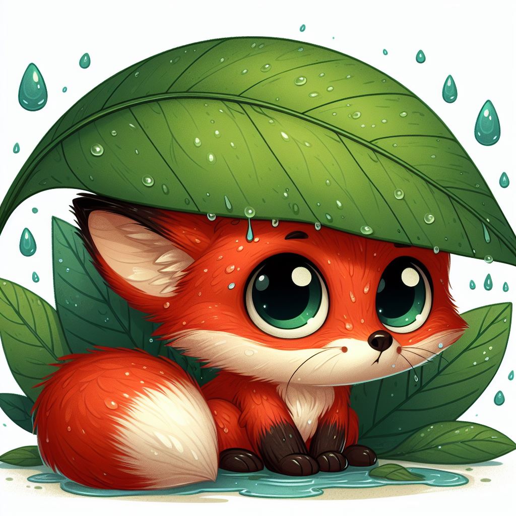 adorable, animal, cartoon, cute, drops, forest, fox, friendly, furry, green, happy, illustration, leaf, nature, playful, rain, shelter, water, wildlife, woodland
