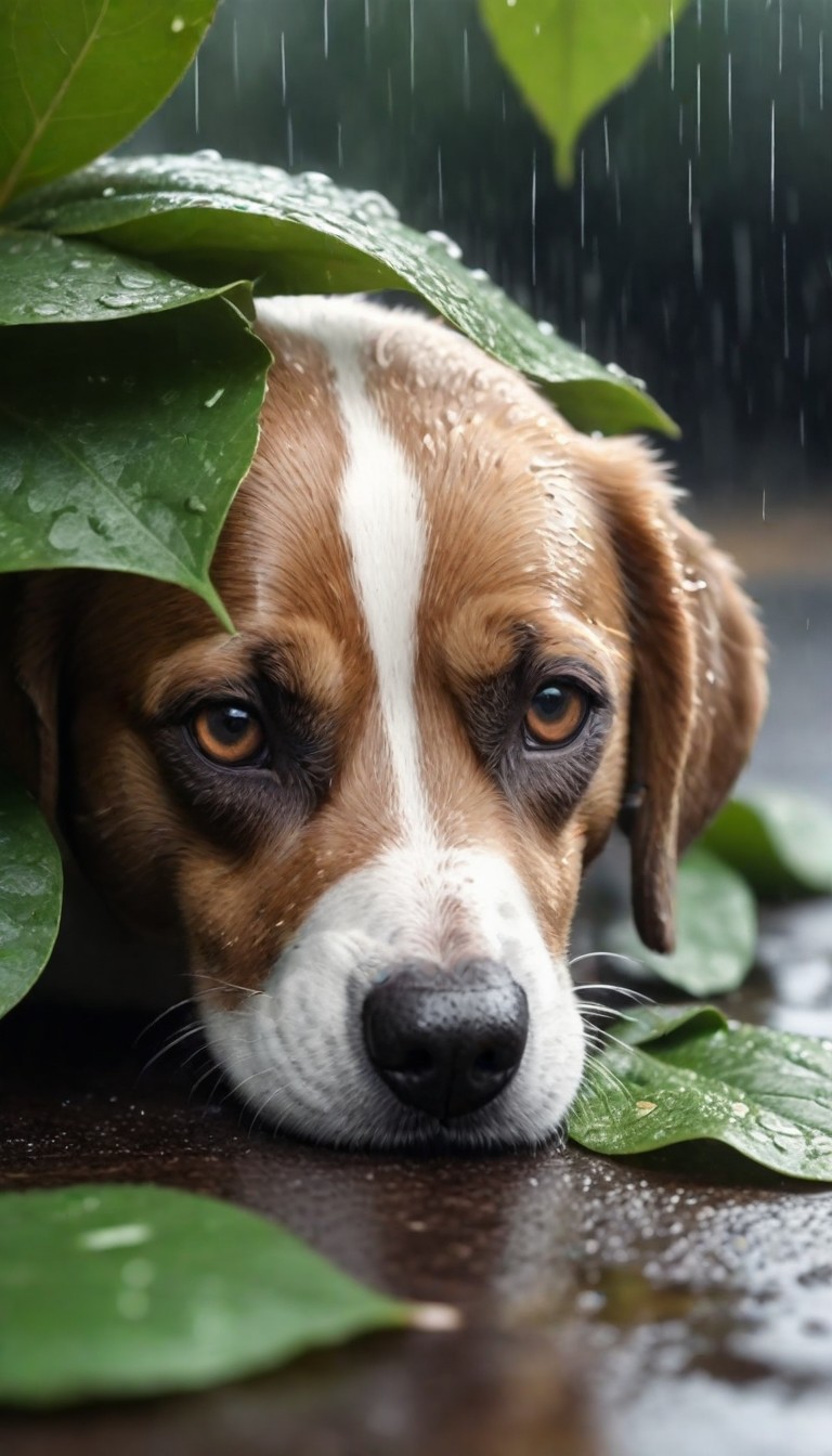 A dog rests its head under green leaves, seeking shelter from the rain falling around it.
