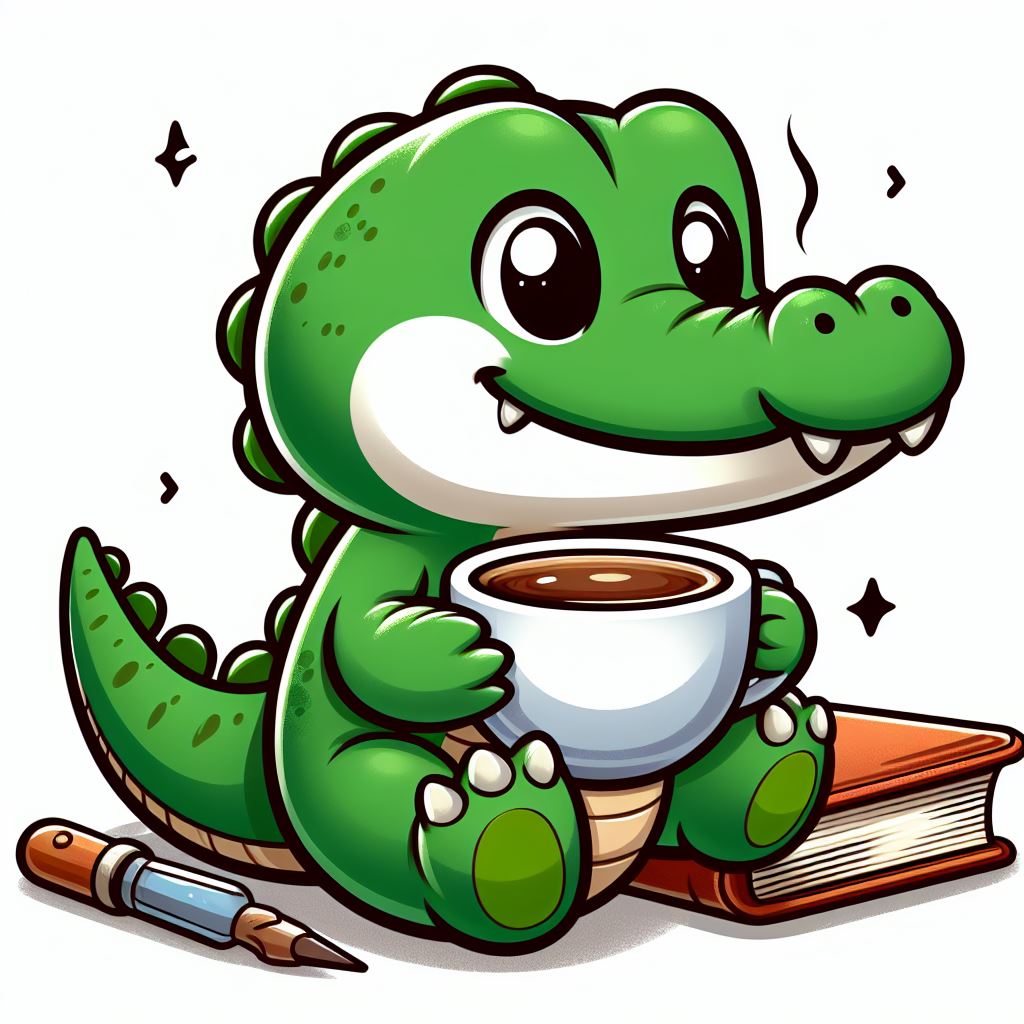 A cartoon crocodile sits with a book, holding a steaming cup of coffee.