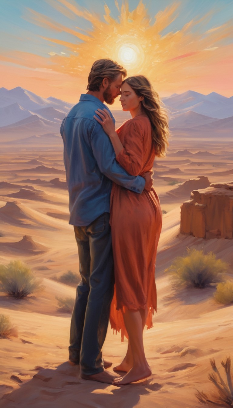 A couple stands close together in a desert landscape, the setting sun casting a warm glow over the sand dunes and mountains in the background.