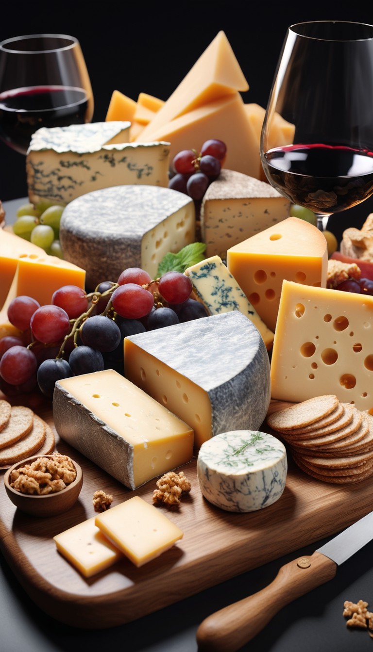 A wooden board overflowing with various cheeses, grapes, crackers, and a glass of red wine.