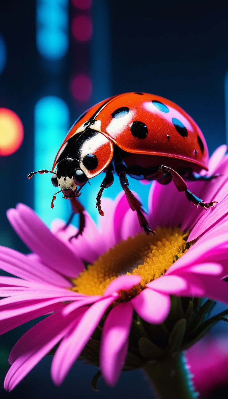 A ladybug with black spots on a red shell sits on a pink flower with yellow pollen.