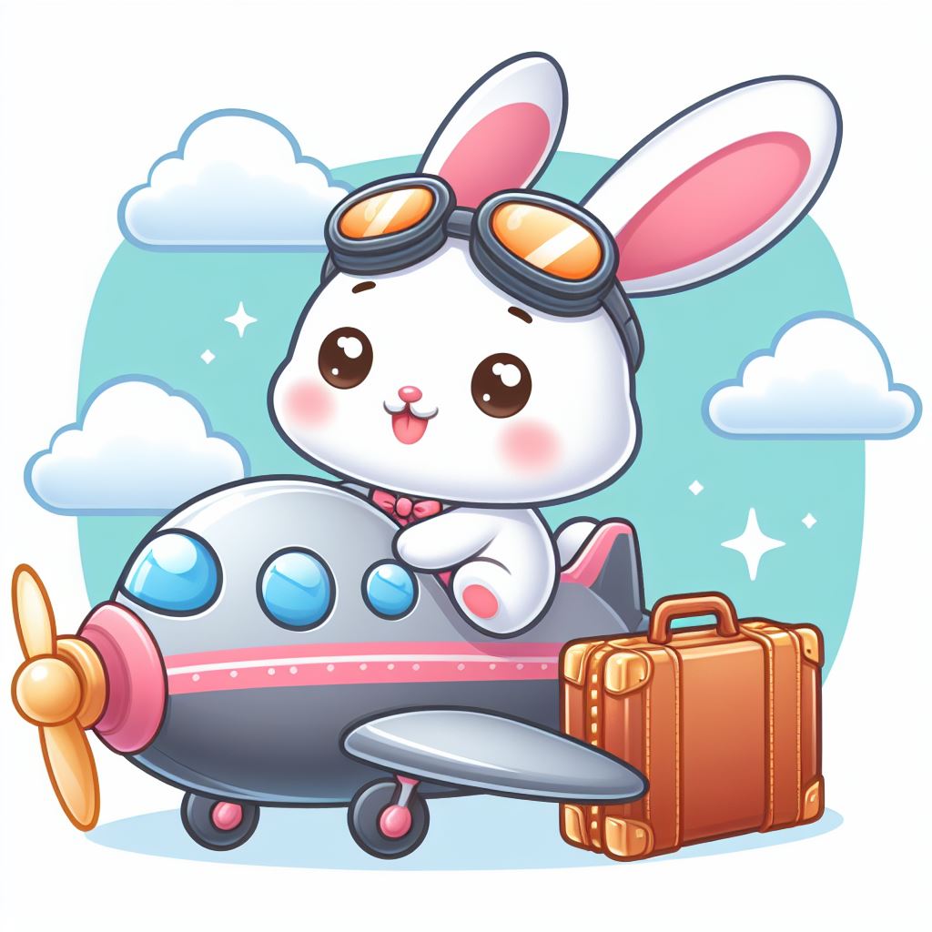 adorable, adventure, airplane, bunny, cartoon, clouds, cute, fantasy, flying, goggles, happy, illustration, pilot, propeller, rabbit, sky, suitcase, travel, whimsical, wings
