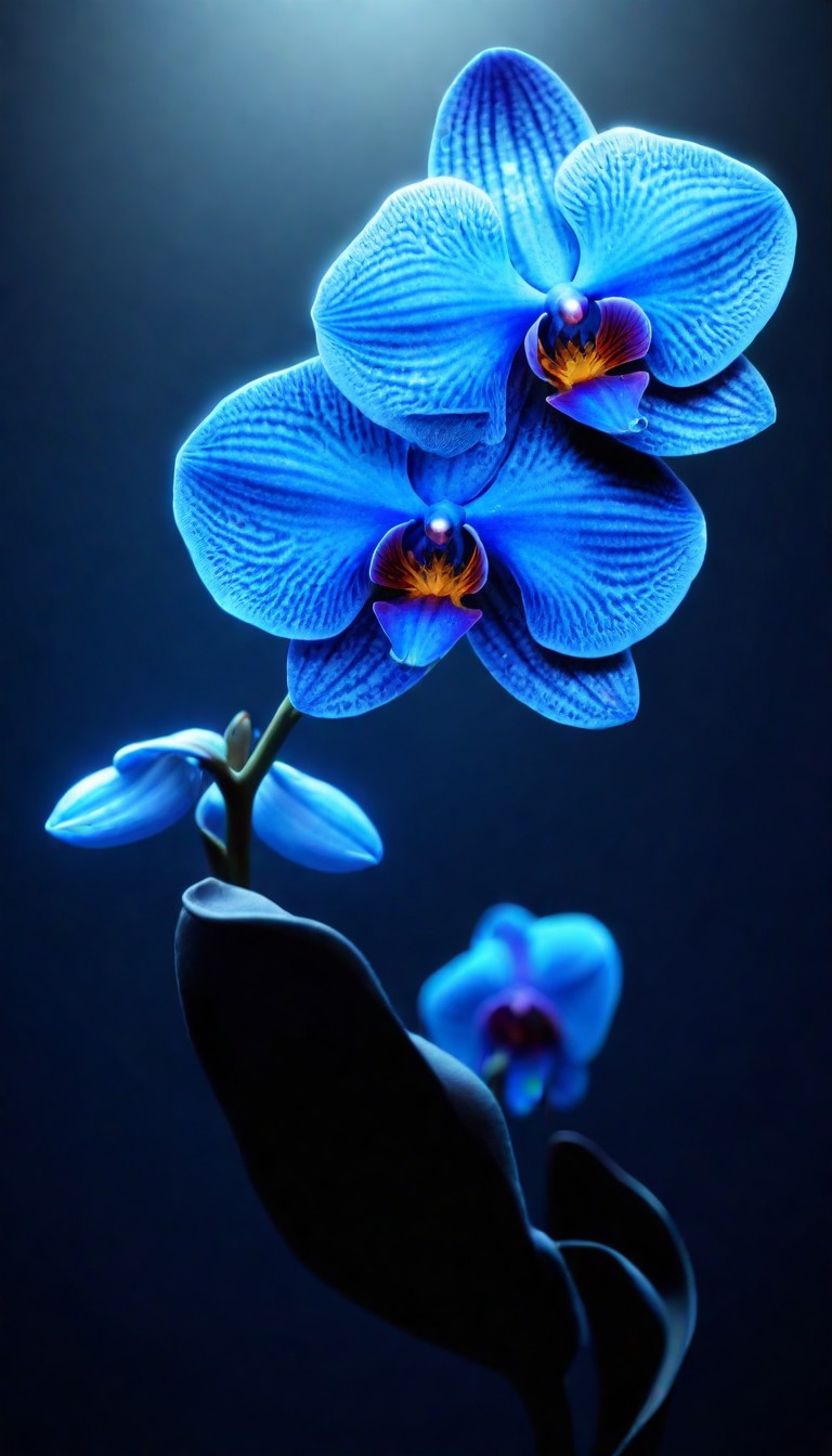 A single blue orchid blossom is illuminated against a dark background.