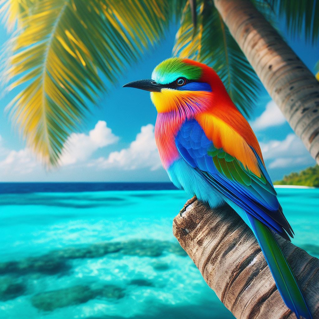 A brightly colored bird perches on a palm tree branch overlooking a turquoise ocean.