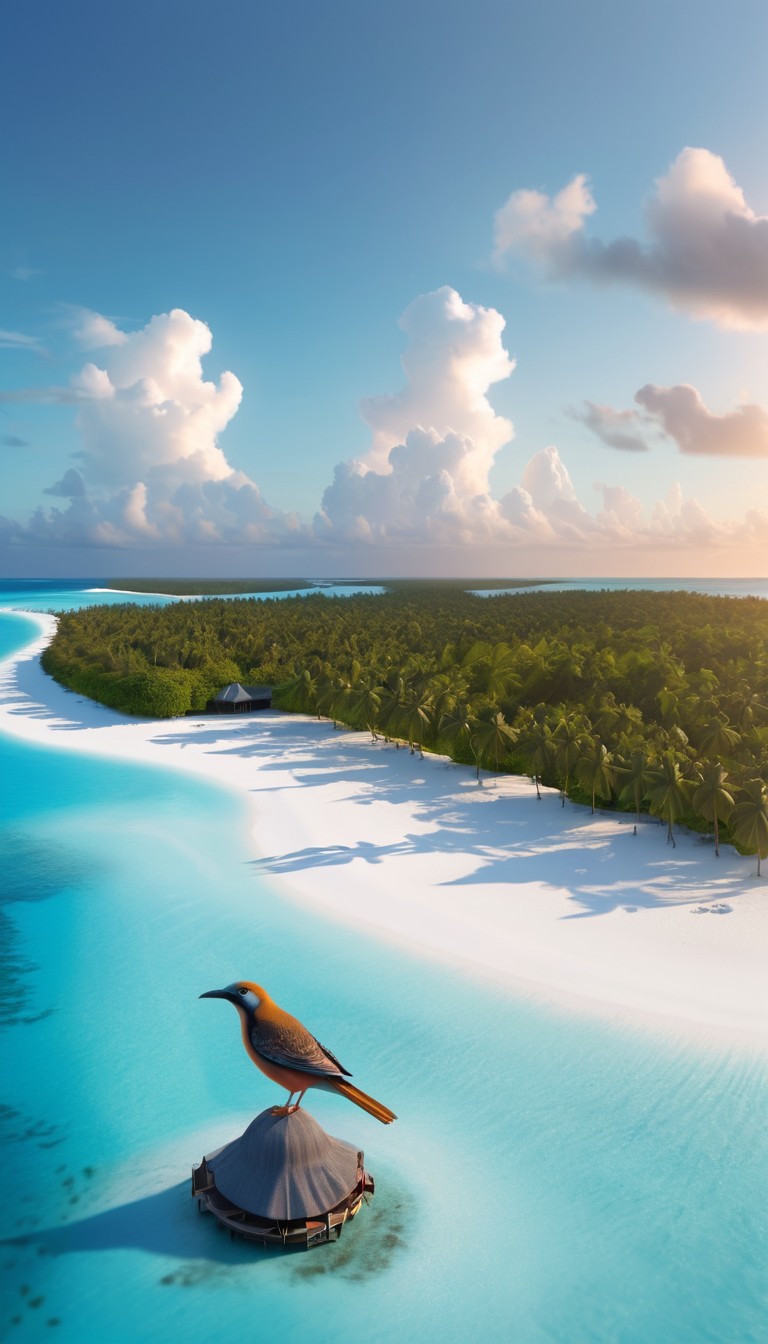 A bird perches on a small hut in the turquoise water of the Maldives. The hut is surrounded by clear blue water and a white sand beach.
