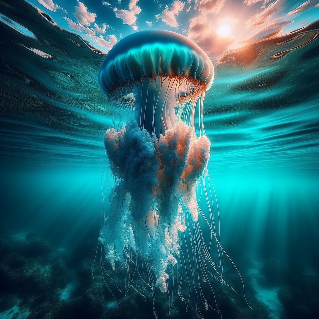 animal, aquatic, blue, colorful, deep, invertebrate, jellyfish, life, marine, nature, ocean, pelagic, sea, sunlight, tentacles, transparent, underwater, vibrant, water, wildlife