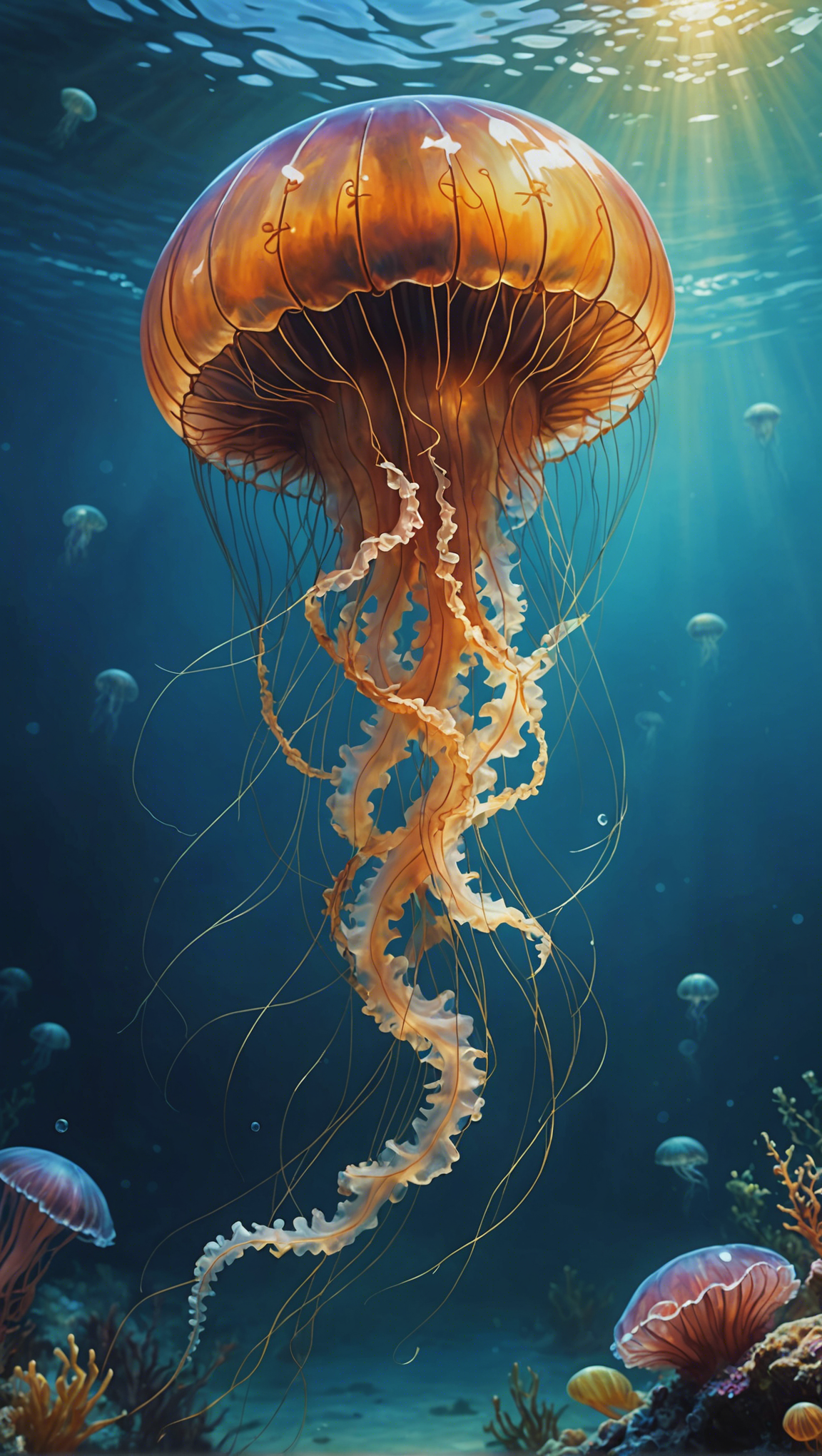 A large, golden jellyfish floats in a sunlit ocean, surrounded by smaller jellyfish.