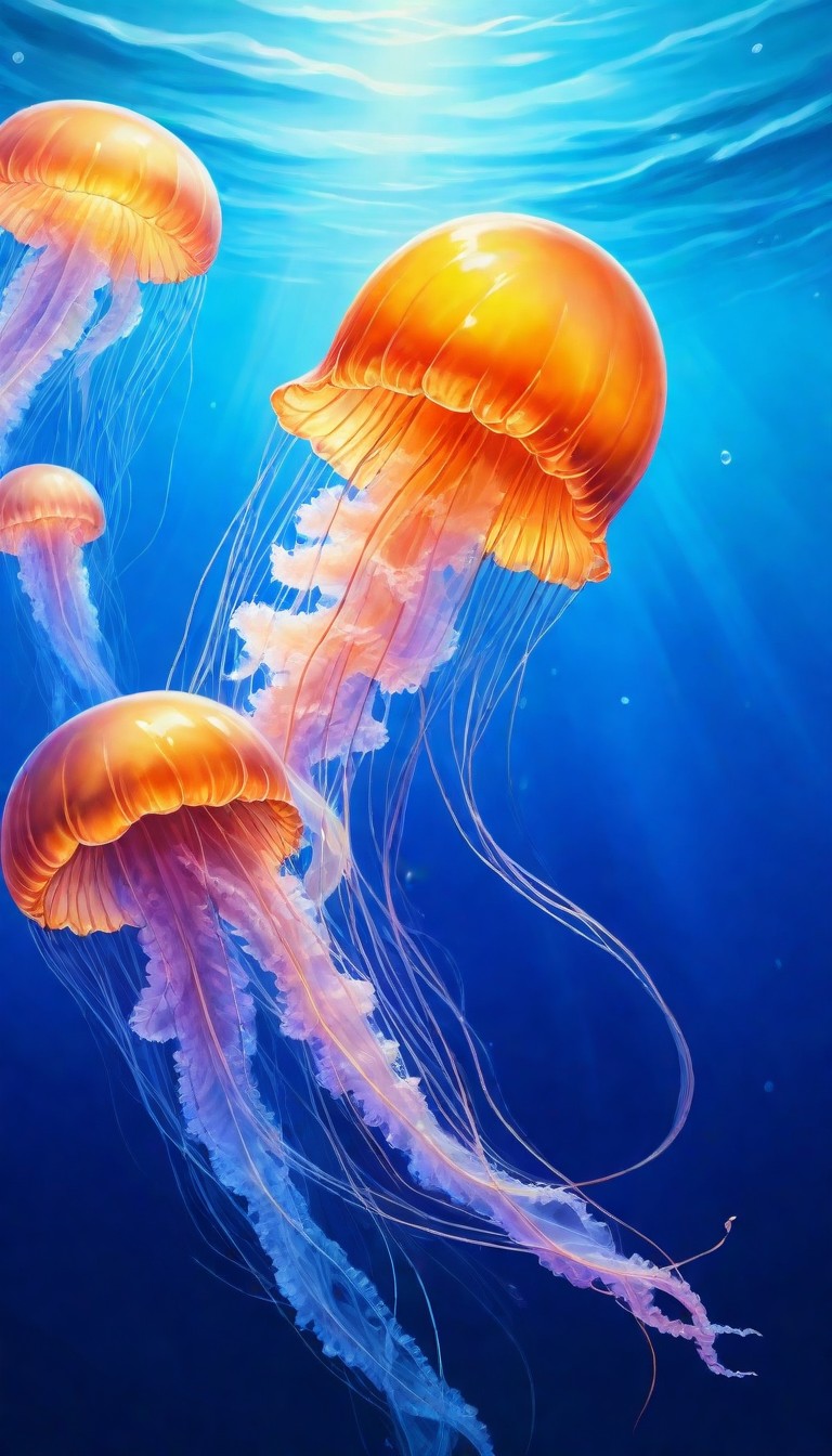 animal, aquatic, beautiful, blue, deep, graceful, invertebrate, jellyfish, life, marine, nature, ocean, orange, sea, swim, tentacles, transparent, underwater, water, wildlife