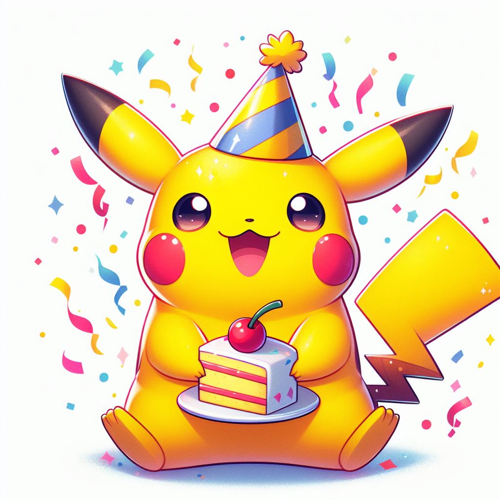 A smiling Pikachu wearing a party hat holds a slice of cake surrounded by confetti.