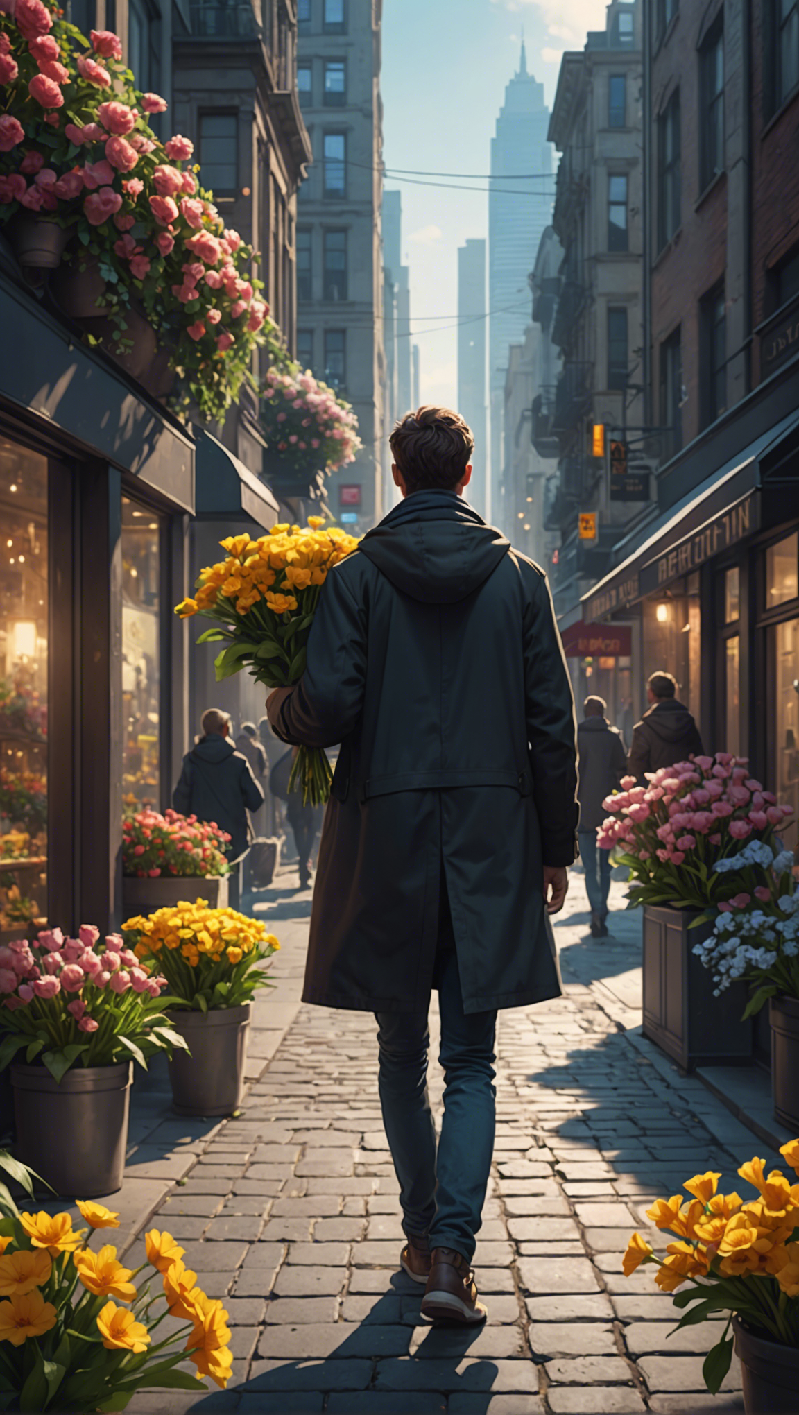 A man in a black coat walks down a cobblestone street lined with flower shops, carrying a large bouquet of yellow flowers.