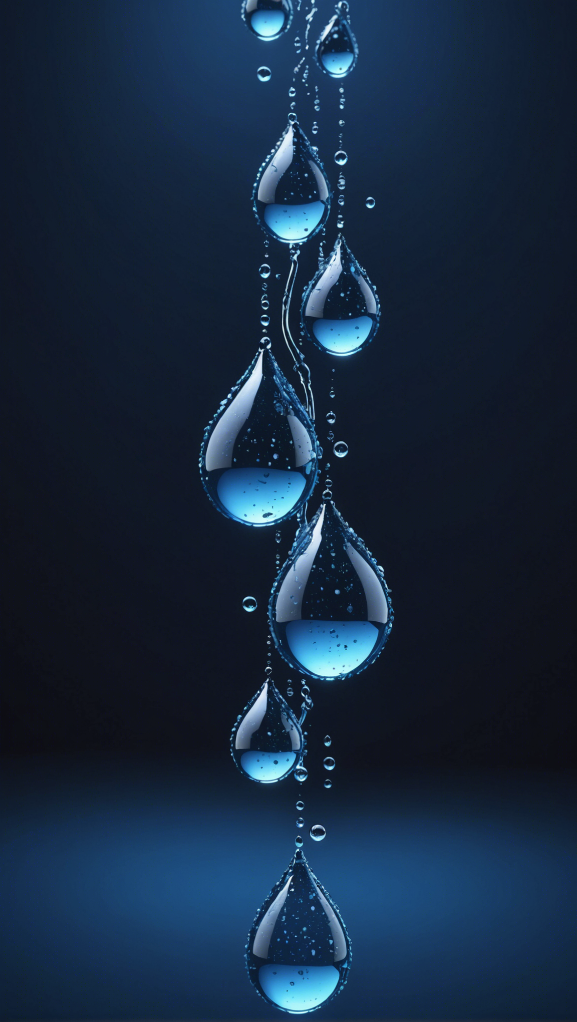 Perfectly round blue water drops fall against a dark blue background, reflecting light and creating a calming image