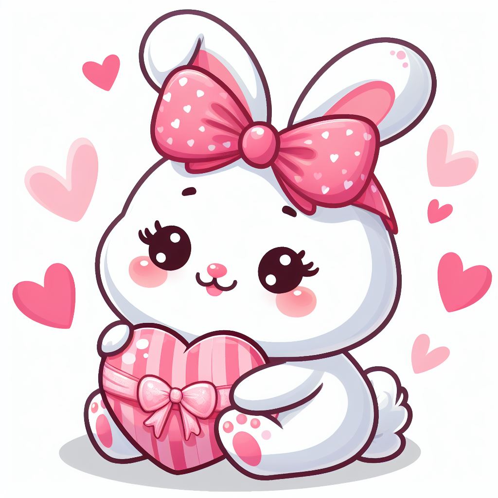 A cartoon bunny rabbit with a pink bow sits and holds a pink heart-shaped gift box.