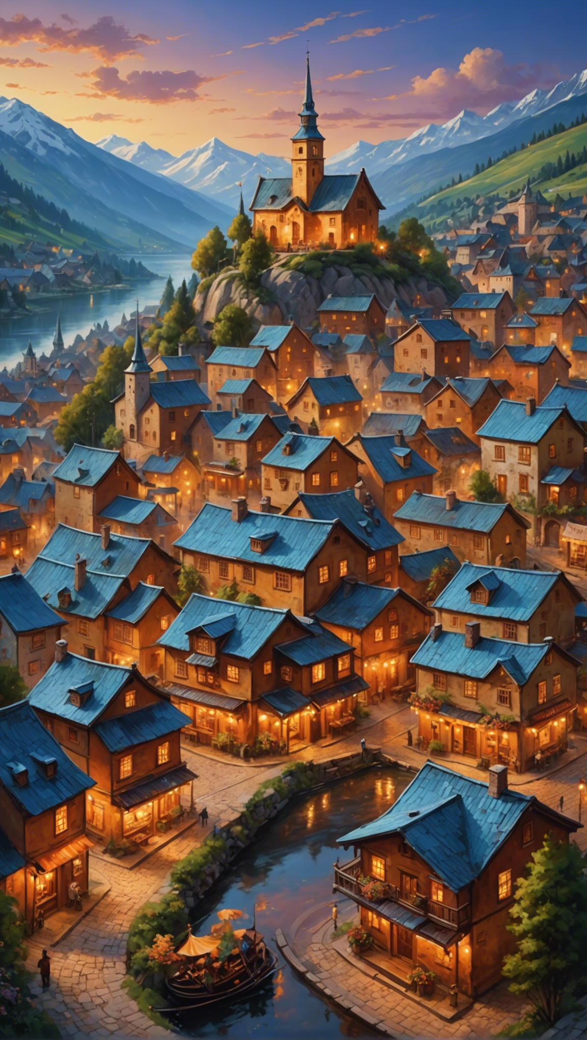 architecture, art, buildings, church, dusk, evening, houses, illustration, landscape, lights, mountains, nature, river, scenery, sky, streetlights, town, travel, village, water