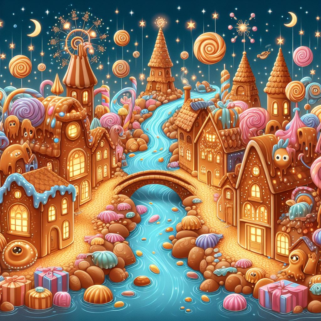 A whimsical gingerbread village with a winding river, lit by twinkling lights, and surrounded by candy and fireworks.