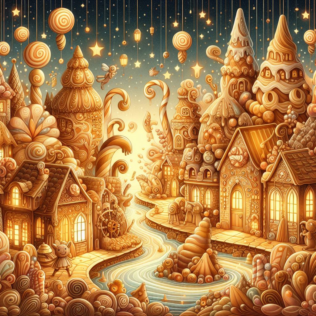 A whimsical candy village illuminated by twinkling stars and glowing lanterns, with a winding river flowing through its heart.