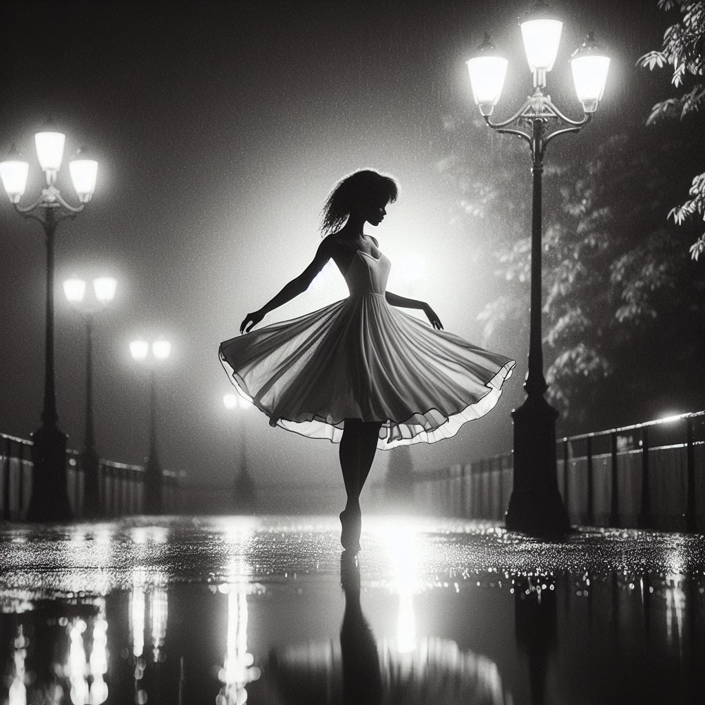 atmosphere, city, dance, dress, lights, monochrome, mood, night, pavement, pose, rain, reflection, romantic, shadow, silhouette, street, streetlight, urban, wet, woman