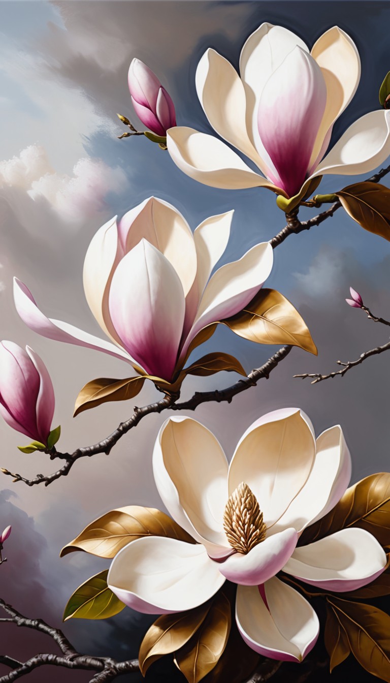 beauty, bloom, blossom, botanical, brown, bud, clouds, cloudy, flora, flowers, golden, gray, leaves, magnolia, nature, petals, plant, sky, springtime, white
