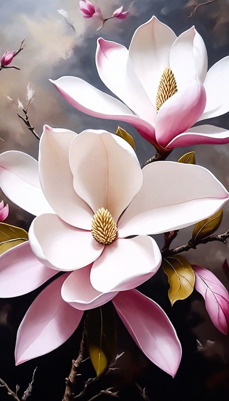 art, beautiful, bloom, blossom, botanical, close-up, color, delicate, floral, flower, garden, magnolia, nature, painting, petals, pink, soft, spring, vibrant, white