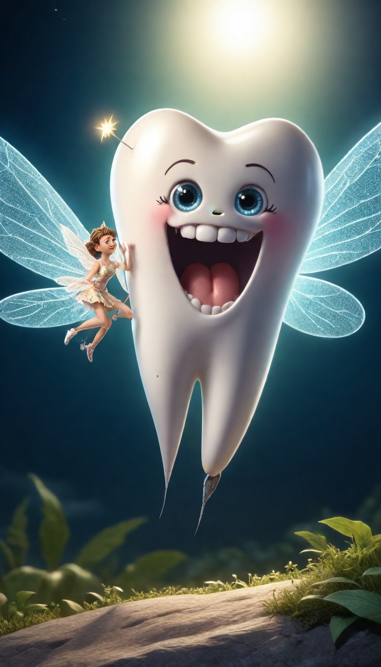 A cartoon tooth fairy with wings flies towards a giant, smiling tooth with wings.