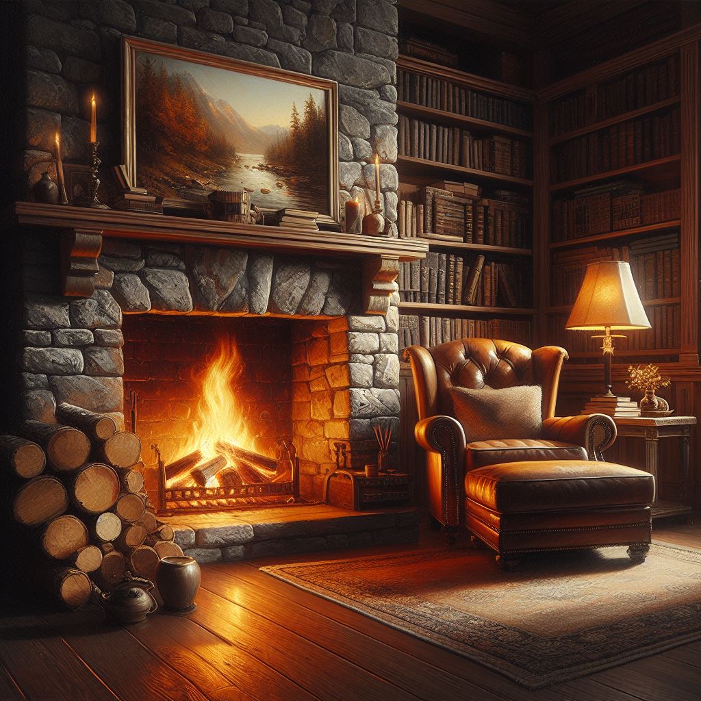 A warm fire crackles in a stone fireplace, illuminating a leather armchair and a well-stocked library.