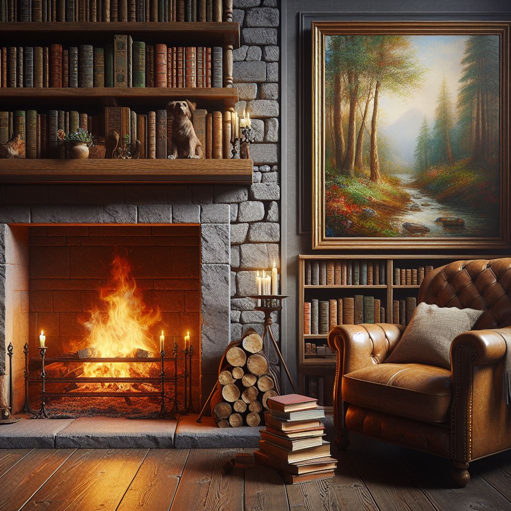 Cozy room with fireplace, leather chair, bookshelves, and forest painting