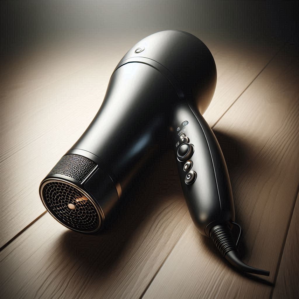 A black hair dryer lies on a wooden surface, with its cord extending to the right.