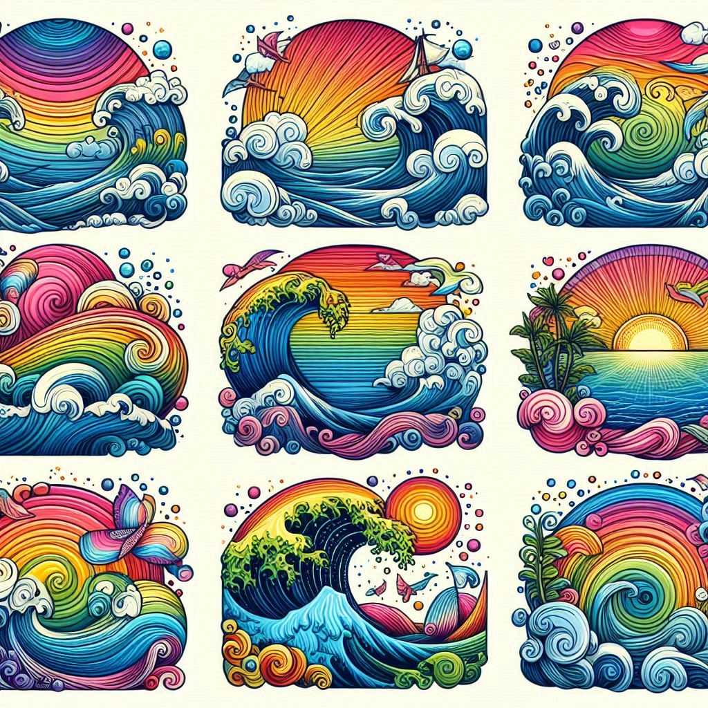 Nine colorful illustrations depicting ocean waves, sunsets, and other beach-related themes.
