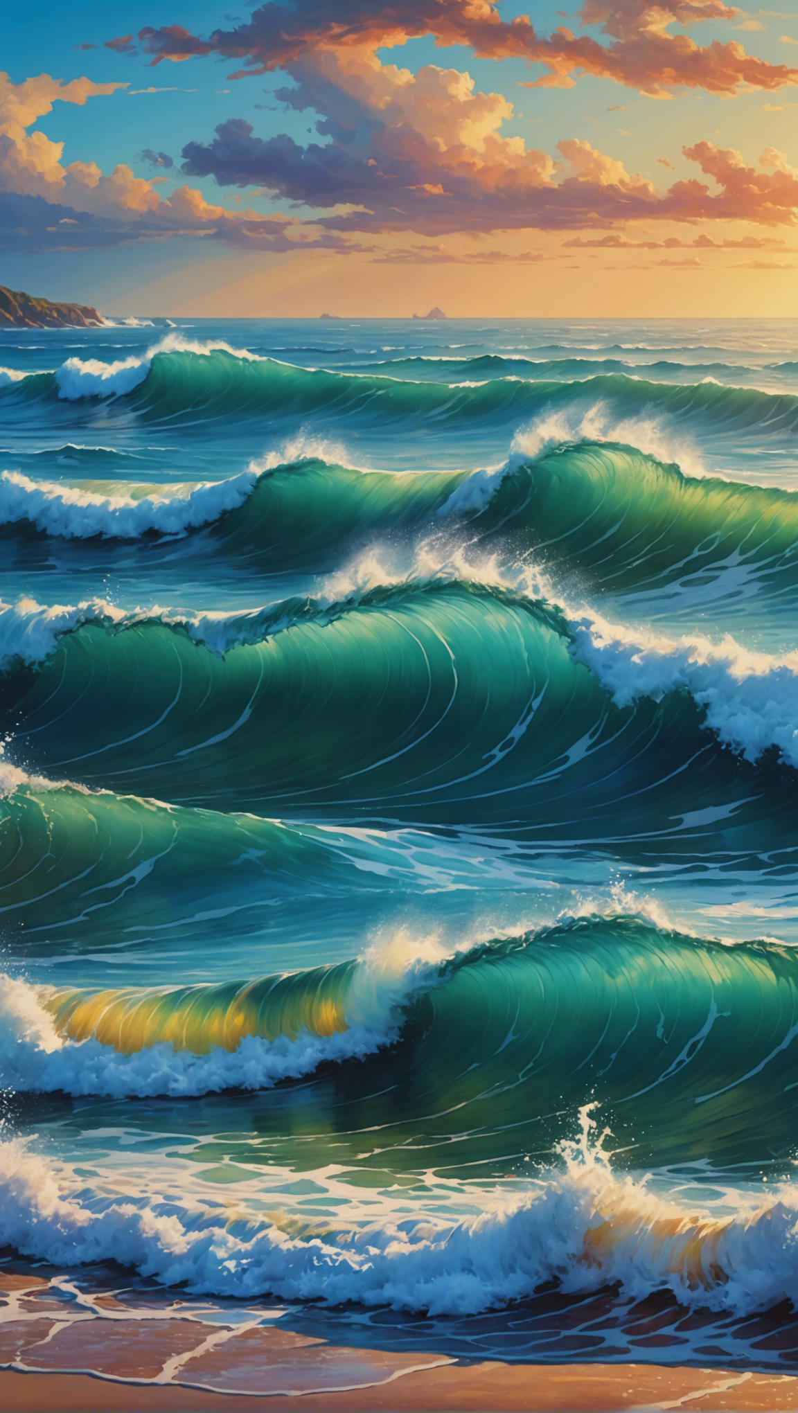beach, blue, clouds, crashing, golden, green, landscape, nature, ocean, peaceful, sand, scenic, sea, seascape, shore, sky, sunset, tropical, water, waves