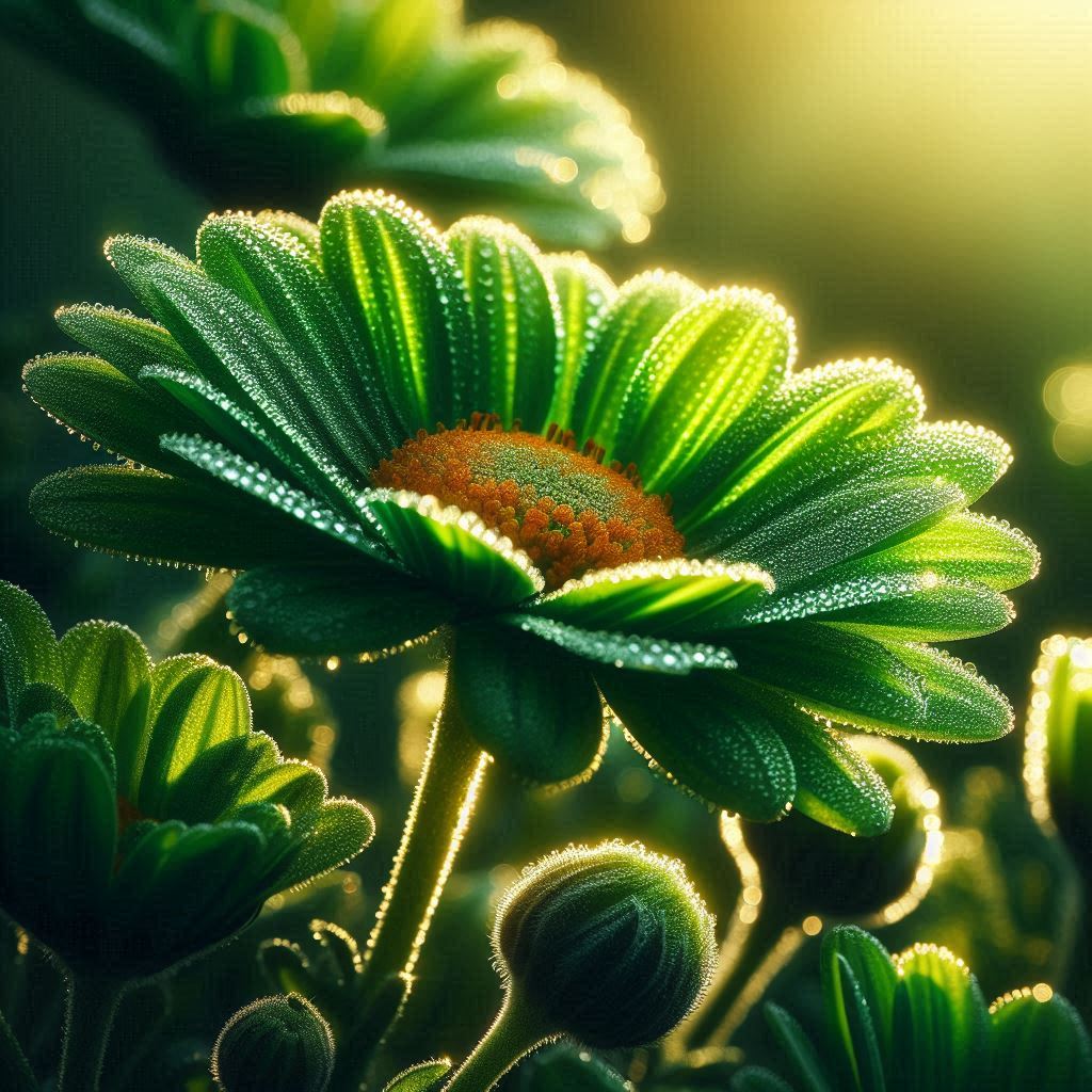 A dewy green daisy bathed in morning sunlight, with other daisies blurred in the background.