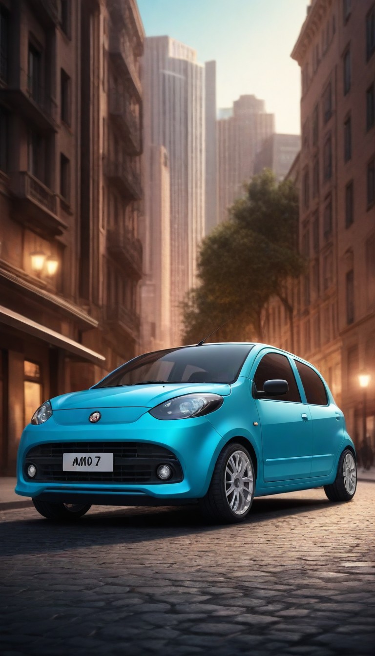 A blue car is parked on a cobblestone street in front of a city building. The sun is setting in the background, casting a warm glow on the scene.