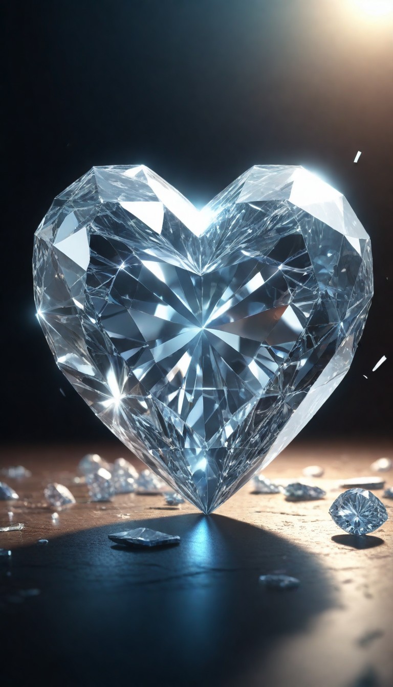A large, heart-shaped diamond sits on a dark surface, surrounded by smaller diamonds.