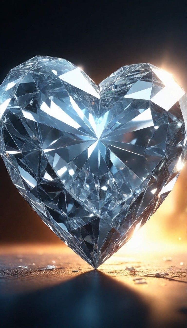 A large, heart-shaped diamond sits on a dark surface, reflecting light.