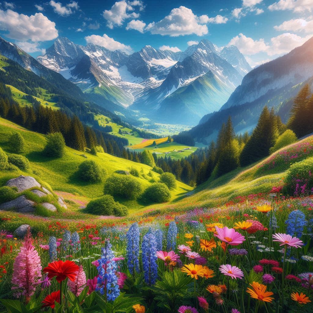 beauty, blue, flowers, grass, green, landscape, meadow, mountain, nature, outdoors, peak, picturesque, range, scenic, sky, snow, summer, travel, valley, wildflowers