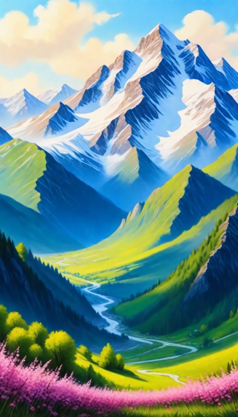 A winding river flows through a lush valley surrounded by majestic snow-capped mountains.