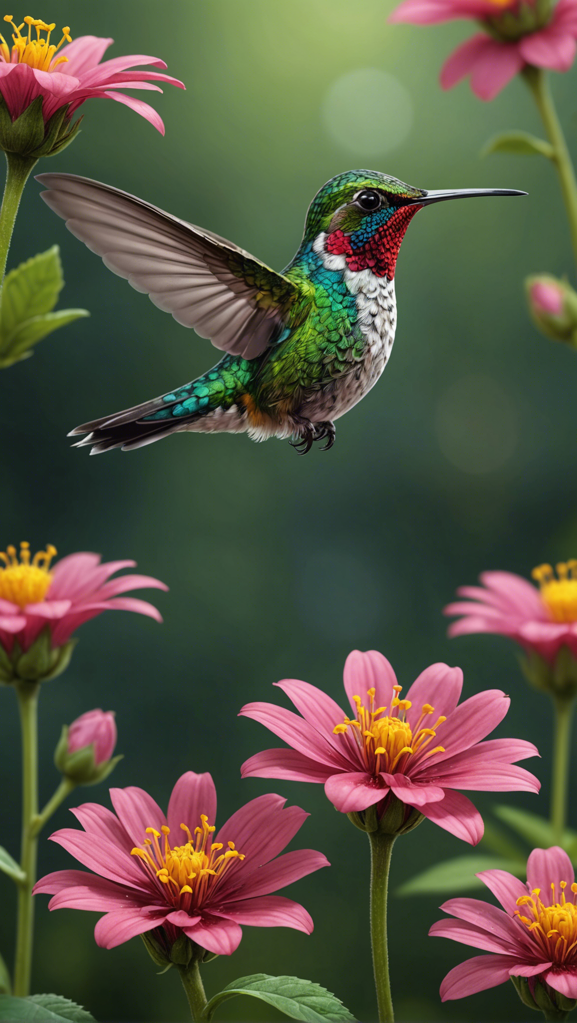 background, beauty, bird, bloom, blossom, colorful, delicate, floral, flowers, flying, garden, green, hummingbird, nature, outstretched, pink, summer, vibrant, wildlife, wings
